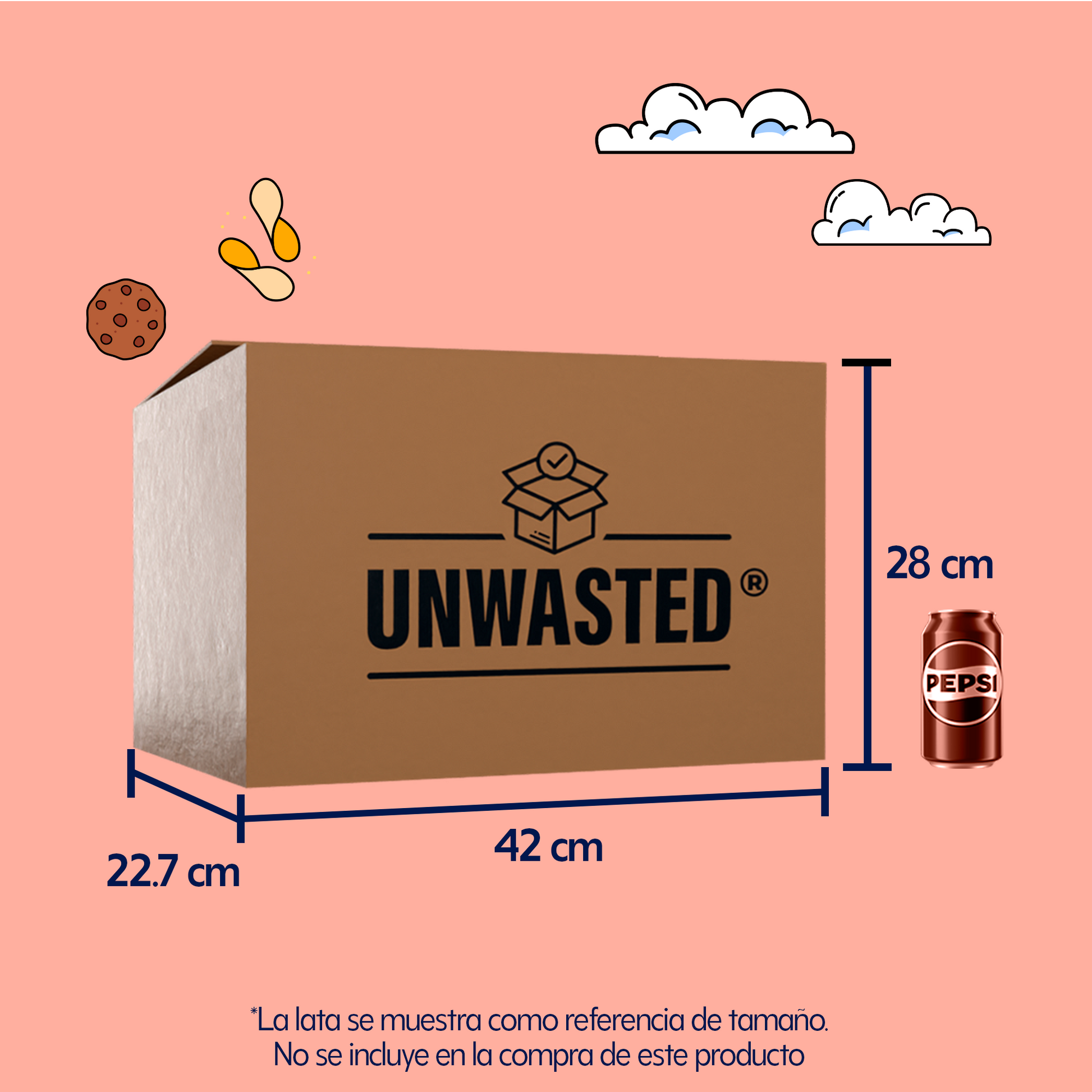 Mystery Box con 15 productos sorpresa de las siguientes categorías: galletas, botanas, cacahuates, dulces y/o avena.